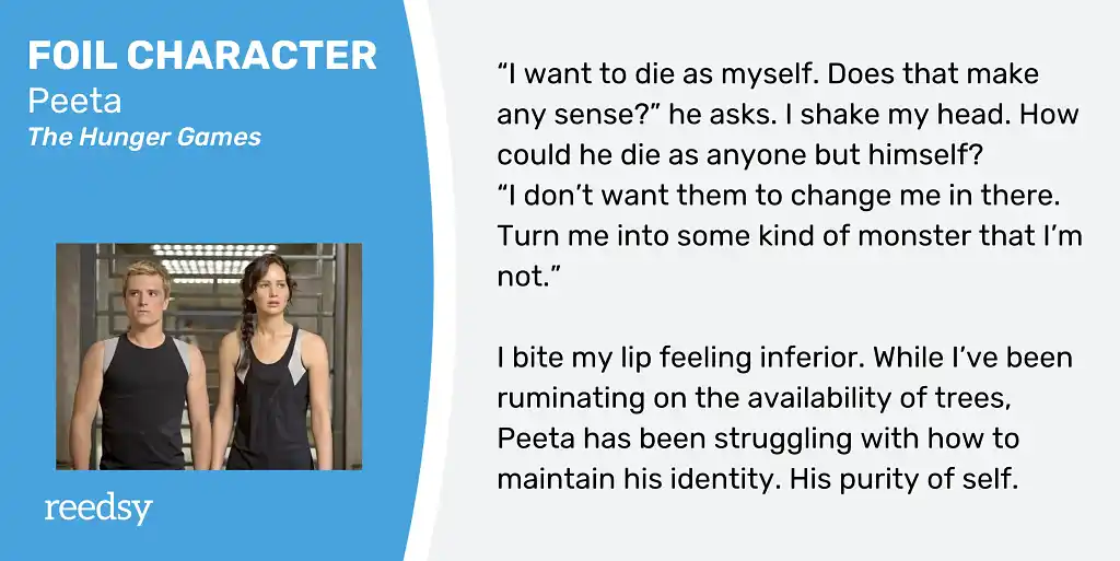 As a foil, Peeta illuminates Katniss’s defining qualities: her instincts to take charge, stay strong, and never rely on anyone. Peeta’s selflessness and ability to connect with others push Katniss to confront her own emotional barriers. Their differences generate internal conflict for Katniss (does she let herself be vulnerable, or keep resisting?), as well as external conflict when they disagree — both during the Games and out of them.