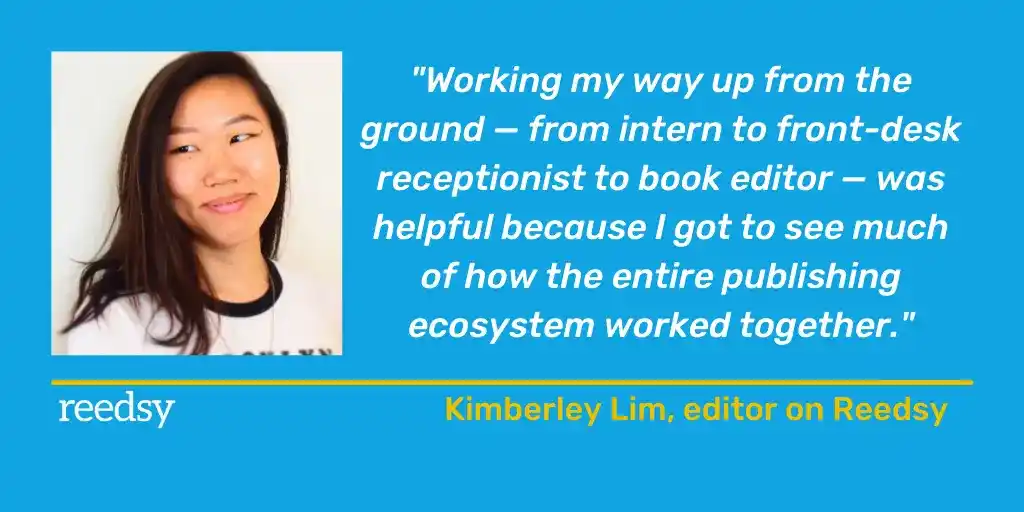 “Working my way up from the ground — from intern to front-desk receptionist to book editor — was helpful because I got to see much of how the entire publishing ecosystem worked together. Additionally, having actual editorial skills on top of general publishing know-how was key — I took a publishing course in my final year at college, which gave me the starting tools and confidence to know I was well-positioned to actually edit books."