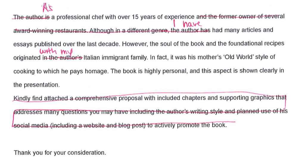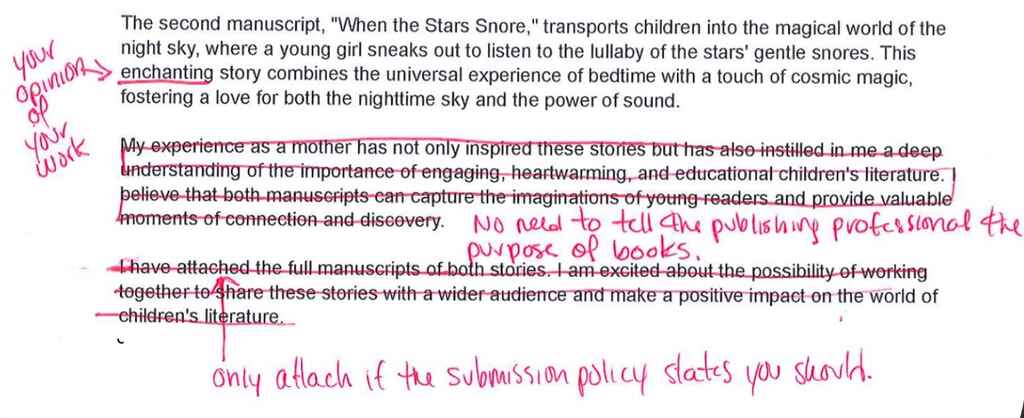 Again, we've got the opinion, and then this, this whole paragraph was just crossed out. There's no need to tell me the origin of fiction, picture books, or publishing in general. That's a given. So save your ink on that. There's probably nothing new that you can tell me about it.