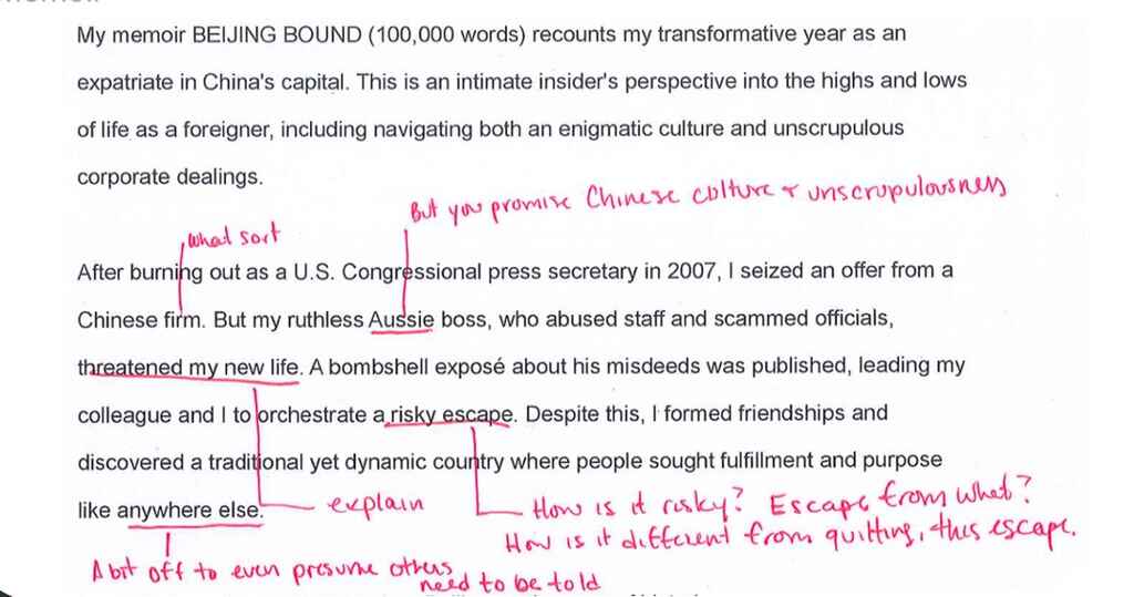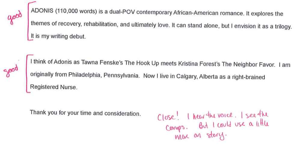 So if you're going to come up with your hook, go and support that hook and stick to what is supporting that hook. Whet my appetite and make me want to find out more and ask for the manuscript. I'm just not getting that.