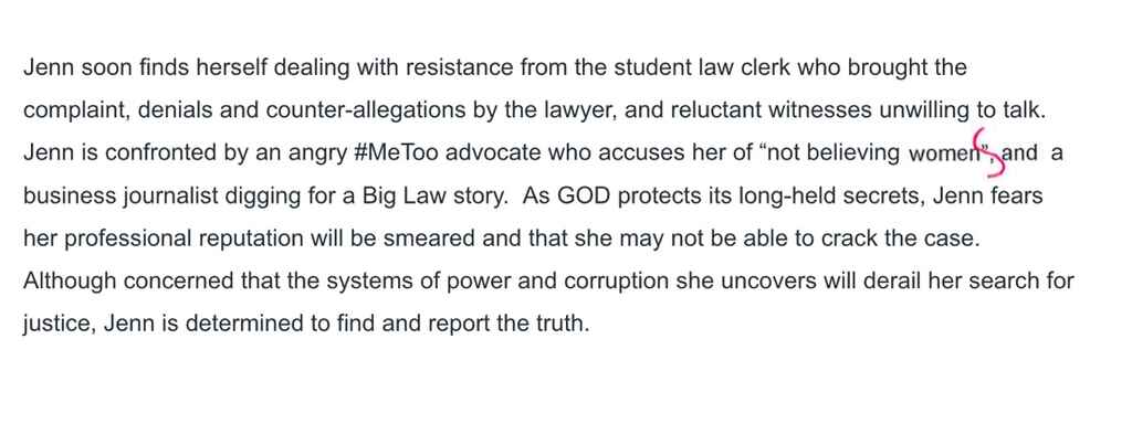 Jenn soon finds herself dealing with resistance from the student law clerk who brought the complaint, denials and counter-allegations by the lawyer, and reluctant witnesses unwilling to talk. Jenn is confronted by an angry #MeToo advocate who accuses her of “not believing women”, and a business journalist digging for a Big Law story. As GOD protects its long-held secrets, Jenn fears her professional reputation will be smeared and that she may not be able to crack the case. Although concerned that the systems of power and corruption she uncovers will derail her search for justice, Jenn is determined to find and report the truth.