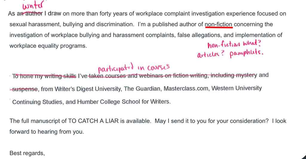 Then the writer talks about the non-fiction experience. But what? Is it articles? I feel like by not saying what the nonfiction is — “published author of nonfiction by not saying exactly what it is, there's, you know, it's a red flag for omission. So if you want to say what it is, say what it is, or just leave it all out.