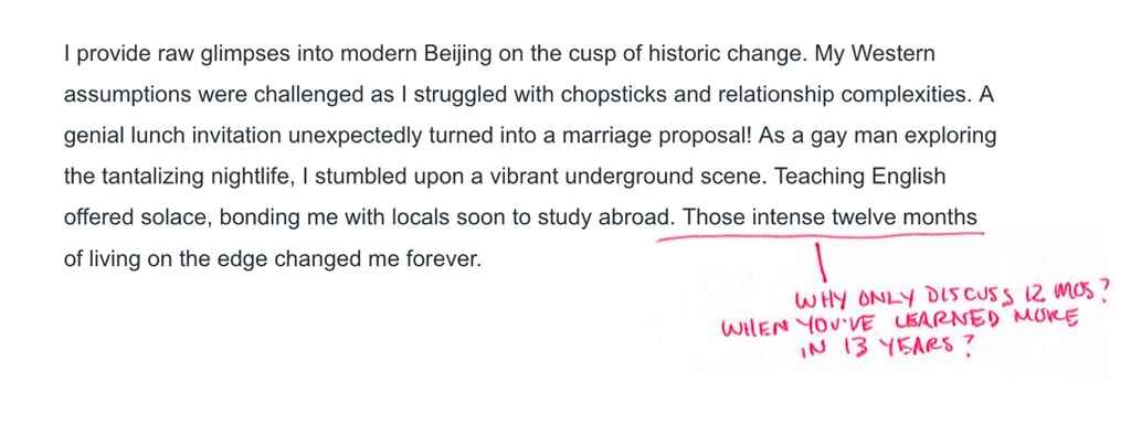 Then, next, I realized that this is more than three paragraphs, but I found it readable, so I didn't mind it. Red flags didn’t come up for me. So sorry — every rule can be broken, as long as it's good. But this, towards the bottom, I changed it a little, I wanted it punchier.