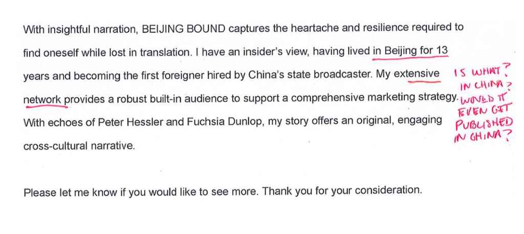 So if you're going to come up with your hook, go and support that hook and stick to what is supporting that hook. Whet my appetite and make me want to find out more and ask for the manuscript. I'm just not getting that.