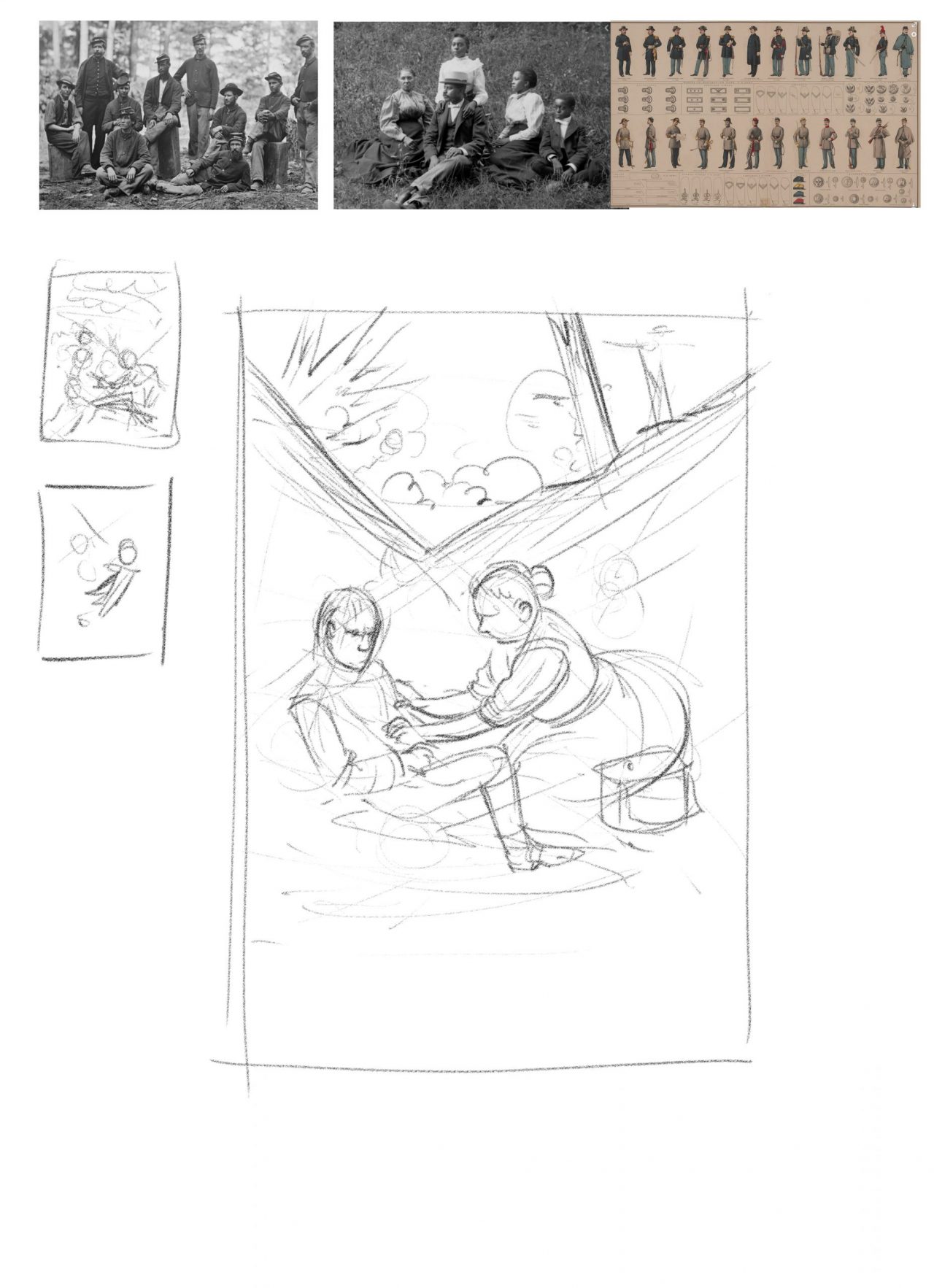 This is a really interesting scene, and the way I would approach this, because it’s more complex than the last illustration, I’d do a little thumbnail to work out the composition. We're in a wartime situation, so there's a lot of stress and drama going on — and you could illustrate this scene in many different ways.