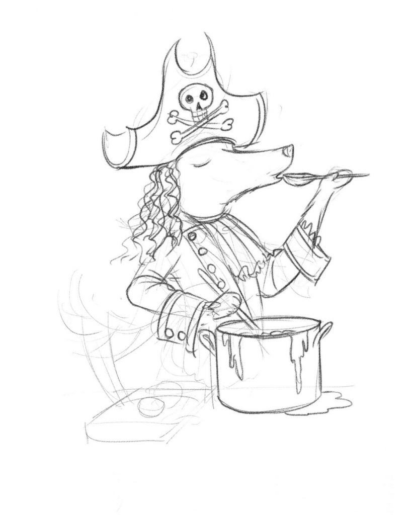 Another thing I like to think about is what else I can bring into the picture — such as the stew dripping from the pot in this illustration. These don’t have to be specific details, it can just be something that adds live to the character beyond what’s described in the text.