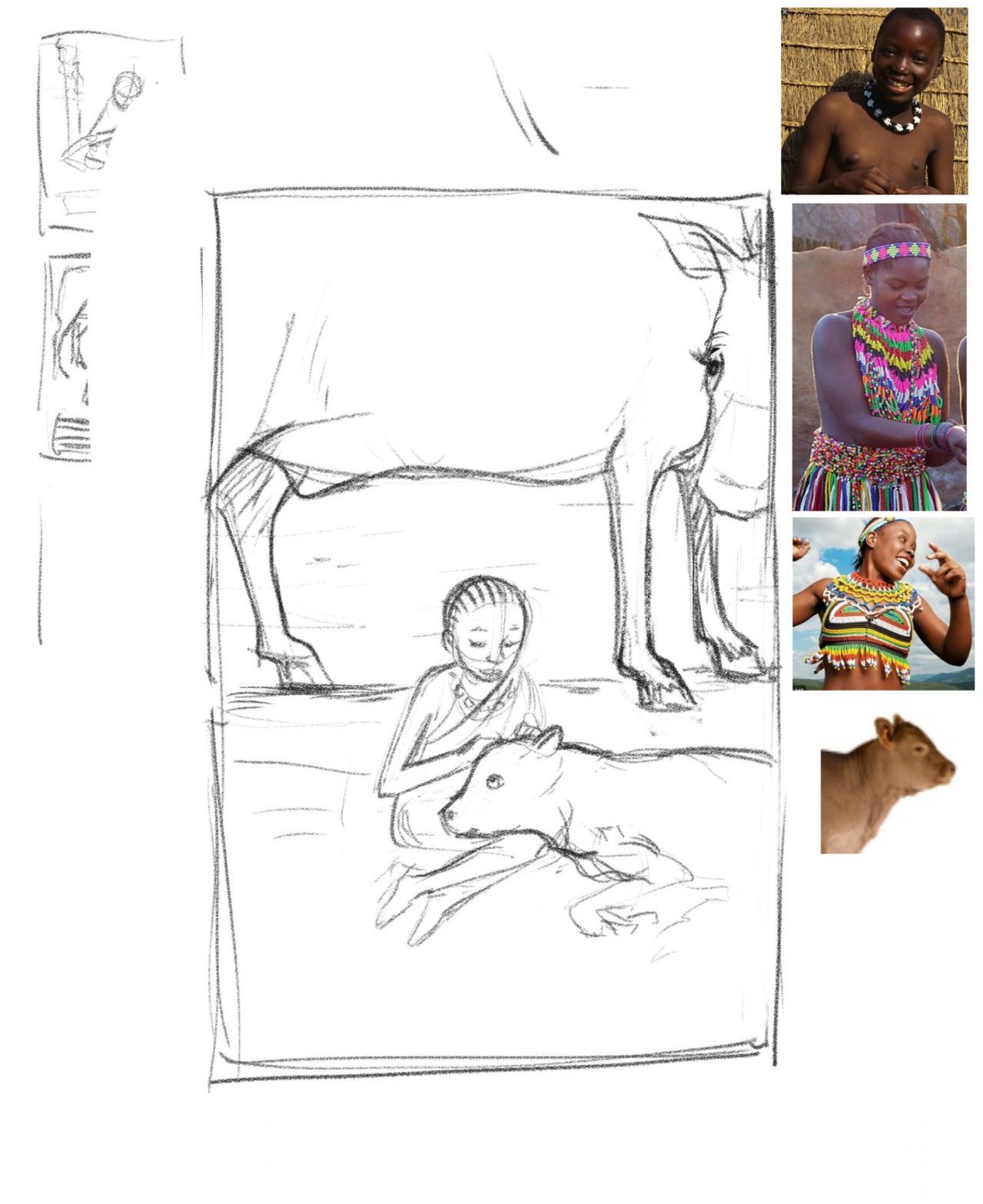 So specifically here, the description calls for a black male cow, and I’m playing with the idea of making this cow so big he goes off the frame. I like the idea of the child and the calf looking really small in the frame in this wonderful, sensitive moment here.