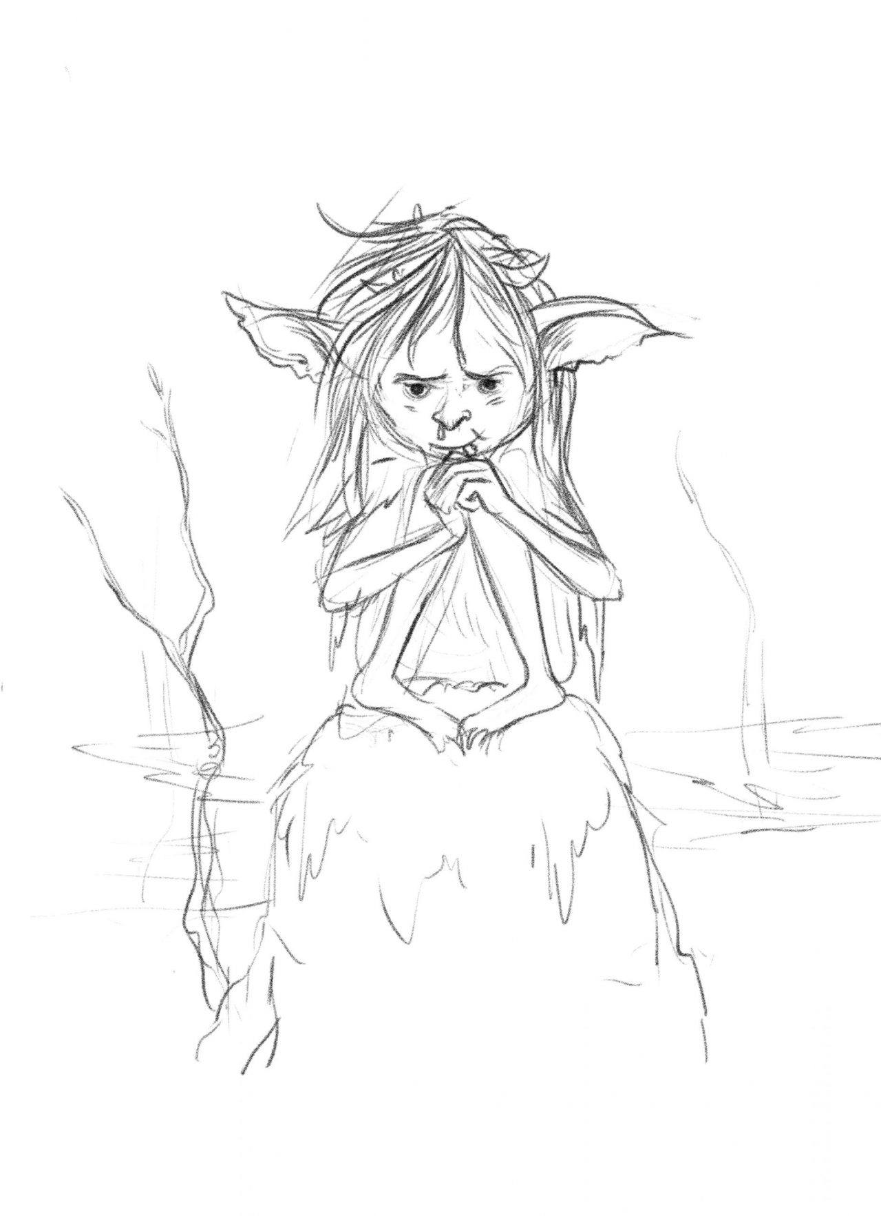 And sometimes when I notice something wrong, and I might move the features I’ve drawn around to try and improve it. For instance, I’d bring the face of this Snigglenitch down a little, to try and figure out its age — also to suit the age range of the readers. I’d need to talk to the author more to know exactly what age group this is for, and the range is quite large, as black-and-white illustrations in Middle Grade and some Young Adult novels are in vogue.